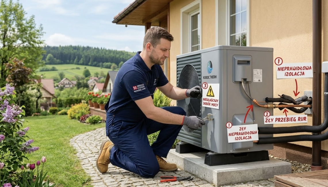 Jednym z najpoważniejszych błędów jest niewłaściwe dobranie mocy urządzenia do zapotrzebowania budynku. Zbyt słaba pompa nie będzie w stanie ogrzać domu w zimie, natomiast zbyt mocna może generować niepotrzebne koszty i pracować mniej efektywnie.
